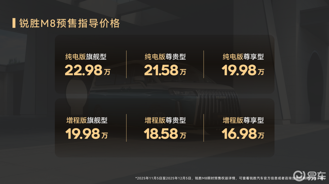 近日,北京汽车制造厂旗下独立MPV品牌锐胜汽车正式开启旗下首款车型——锐胜M8的预售活动。这款定位大型MPV的新车,以16.98万元起的增程版预售价和19.98万元起的纯电动版预售价,为消费者提供了一个高质价比的购车选择。在当前30万级MPV市场占据主导地位的背景下,锐胜M8凭借其亲民的价格和越级的产品力,有望打破市场格局。