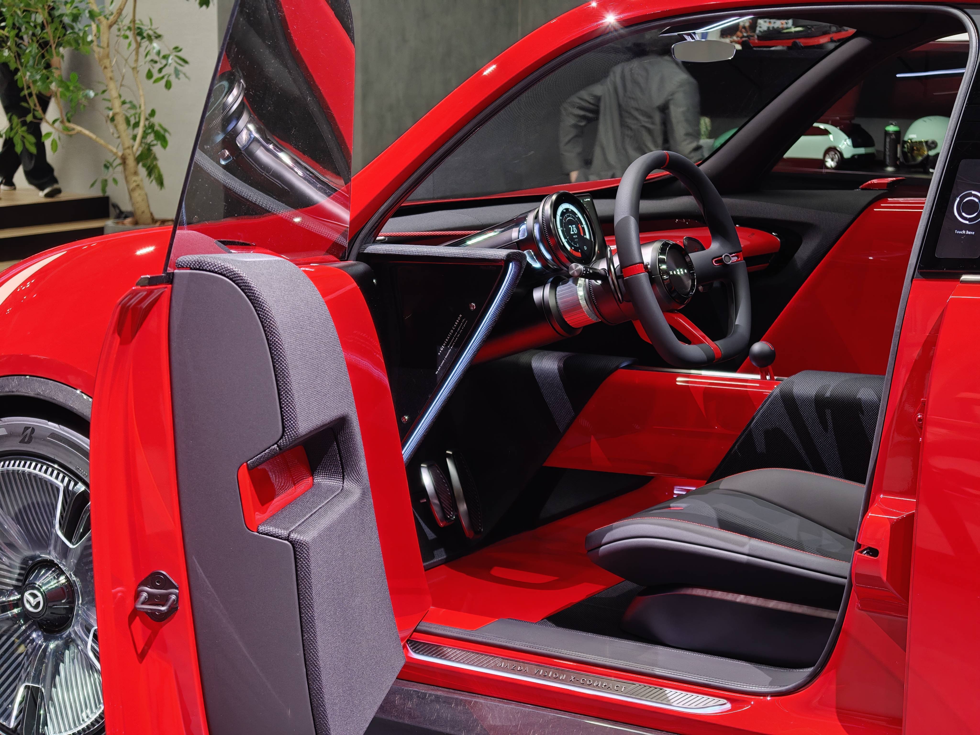 内饰空间成为这款概念车的最大亮点。大量红色钢琴烤漆面板贯穿前IP台、中央操纵台及车门内饰,形成统一的视觉主题。方向盘、座椅及安全带均采用红色线条点缀,延续了马自达一贯的运动风格。特别值得关注的是,前排车门搭载了碳纤维固定挡板,内置氛围灯系统,车门闭合时可实现无缝拼接,其再生碳材质更凸显了环保理念。