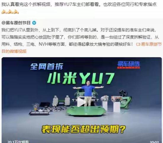 一辆崭新的小米YU7在镜头前被完全拆解,从车身骨架到电池护甲,从域控模块到电子元件,每个细节都被放大呈现——这场由易车原创节目与小米汽车联合发起的直播拆解,不仅冲上微博热搜,更引发了公众对智能汽车安全与品质的深度讨论。