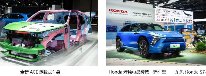 Honda展台还展出了荣获“2024中国十佳车身”大奖的全新ACE承载式车身。该车身秉承Honda“共存安全”理念,在保护自身的同时,降低对对方车辆的冲击,实现双向车辆安全保护。作为高刚性、强韧性的纯电动车专用骨架,其大量采用高强度钢,高强度钢占比高达68%,航空航天级热成型钢占比25%,扭转刚性达4万牛米/度,多方位保护消费者出行安全。目前,该车身已搭载于Honda烨纯电品牌第一弹车型——东风Honda S7。