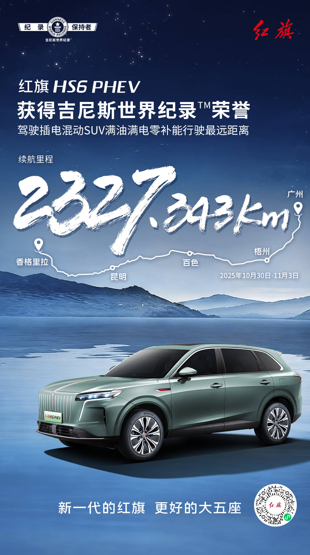 红旗HS6 PHEV以一场跨越2000公里的极限挑战,在新能源SUV领域投下重磅炸弹。这辆大五座旗舰车型从香格里拉启程,满油满电直抵广州,最终以2327.343公里的成绩刷新吉尼斯世界纪录,成为"驾驶插电混动量产SUV满油满电零补能行驶最远距离"的保持者。这一壮举不仅超越了传统认知中SUV的续航极限,更以量产交付标准车型完成挑战,车内座椅加热、通风等舒适配置全程开启,将真实使用场景纳入测试范畴。