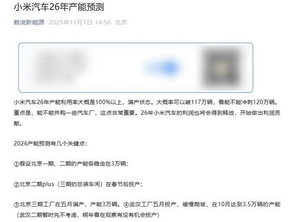 为支撑更远期的市场目标,小米汽车正加速推进产能布局。北京二期Plus项目(三期工厂总装车间)计划于2026年春节后投产,武汉一期工厂则定于同年5月启动,预计10月实现月产3.5万辆的规模。若产能爬坡顺利,叠加潜在的战略并购,2026年全年产能有望突破117万至120万辆。这种“自建+并购”的双轨策略,为产能快速释放提供了双重保障。