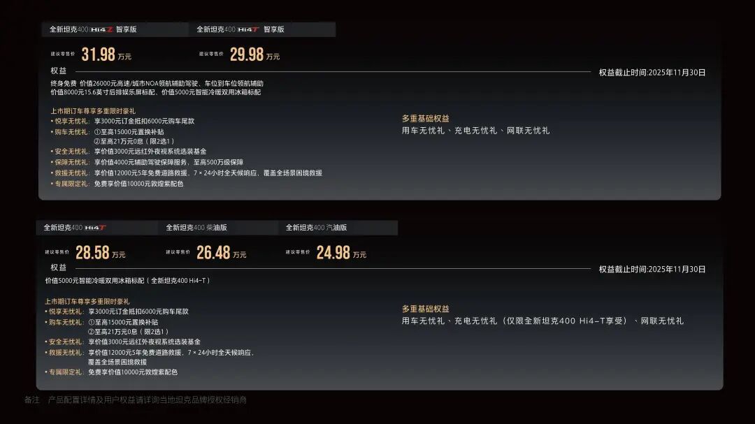 全新坦克400提供五种动力版本,售价区间覆盖24.98万至31.98万元,成为同级动力类型最丰富的车型。针对传统越野玩家,2.0T汽油版、2.4T柴油版及Hi4-T标准版延续机械四驱的可靠性能;Hi4-T智享版通过非解耦结构机械四驱与电机协同,在提升平顺性的同时优化油耗表现;新增的Hi4-Z智享版则采用解耦四驱架构,搭载59.05kWh大电池,实现200km纯电续航,精准切中城市通勤与轻度越野的双重需求。