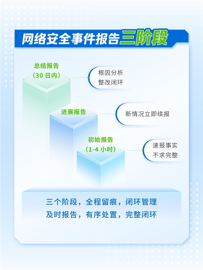 ▸网络安全事件报告分为初始、调查和总结三阶段,全程留痕,有序处置