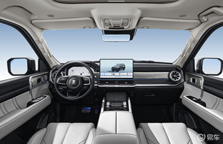 车身尺寸保持中大型越野定位,长宽高分别为4964/1970/1905mm,轴距2850mm。通过性参数方面,接近角33°、离去角31°,最小离地间隙224mm,涉水深度达800mm,具备应对城市内涝的实用能力。侧面采用宽体轮眉搭配铆钉装饰,全新黑化轮圈进一步凸显硬派气质。