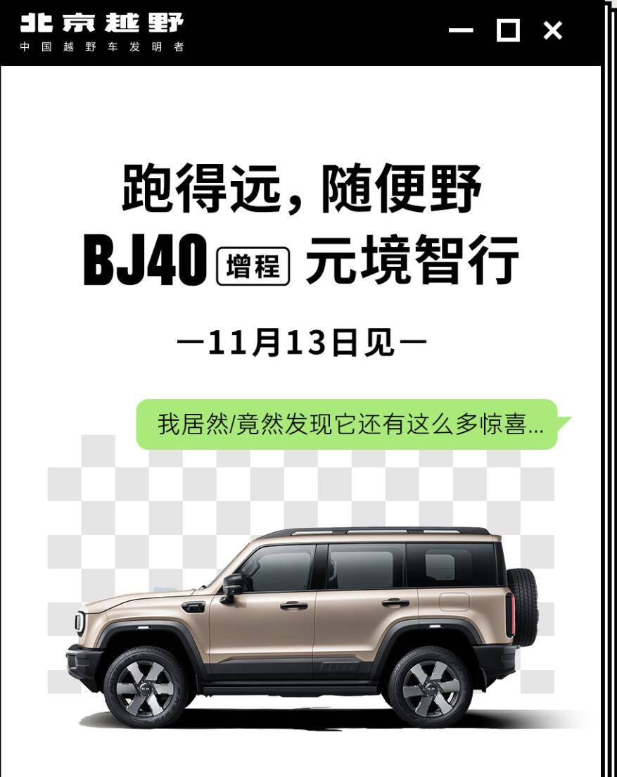 北京越野BJ40增程元境智行版计划于11月13日正式上市。官方微博已发布相关消息,新车在智能化方面或将迎来重要升级,智能辅助驾驶系统预计会得到优化。该车还将配备11种智电ATS全路况模式,进一步增强其适应不同路况的能力。这款车型的上市,无疑将为喜欢硬派风格的消费者提供新的选择。
