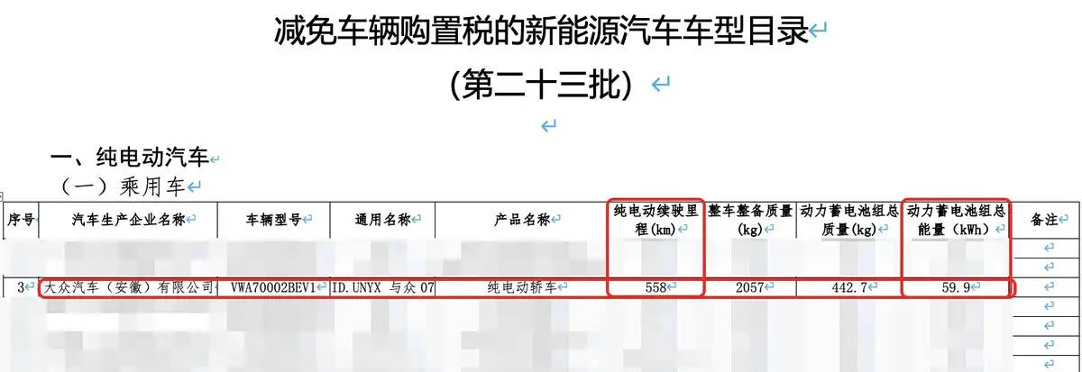 工信部最新公布的《第二十三批减免车辆购置税的新能源汽车车型目录》中,大众安徽旗下全新车型与众07的续航参数正式披露。这款基于全新电子电气架构打造的新能源SUV,将搭载59.9kWh容量电池组,CLTC工况下续航里程达558公里。