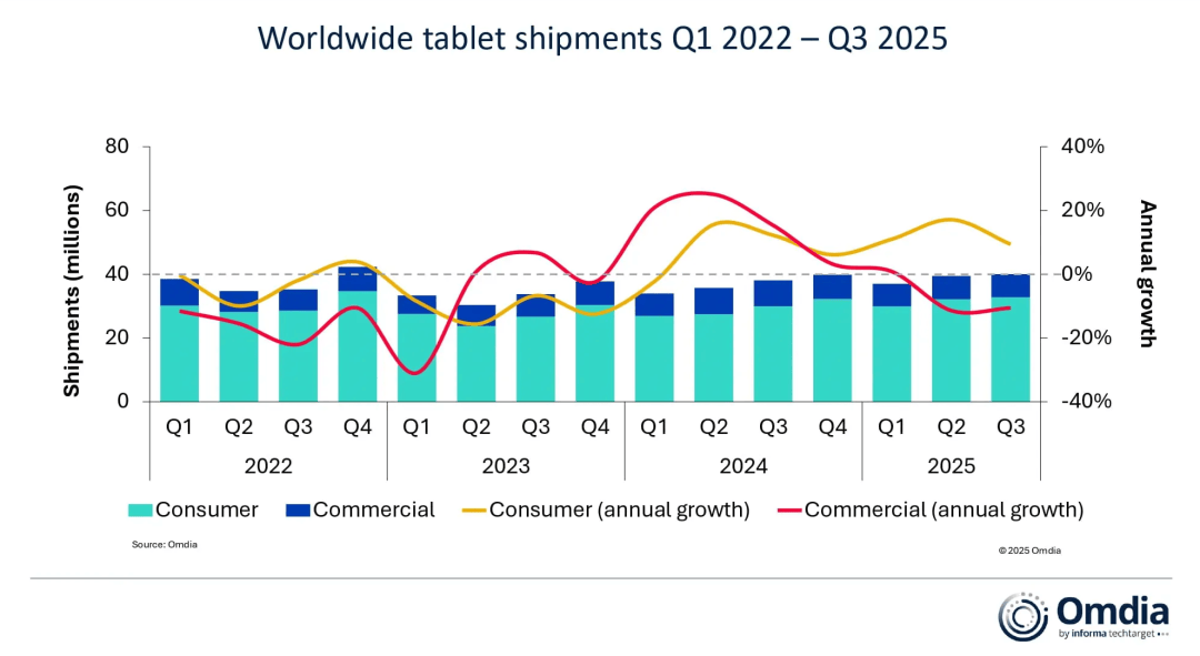 市场研究机构Omdia(前身为Canalys)最新发布的全球平板电脑市场报告显示,2025年第三季度(7月至9月)全球平板电脑市场延续增长态势,出货量达到约4000万台,同比增长5.1%。这是该市场连续第七个季度实现正增长,主要得益于中国市场的强劲需求以及中国厂商在中东和亚太地区的业务扩张。