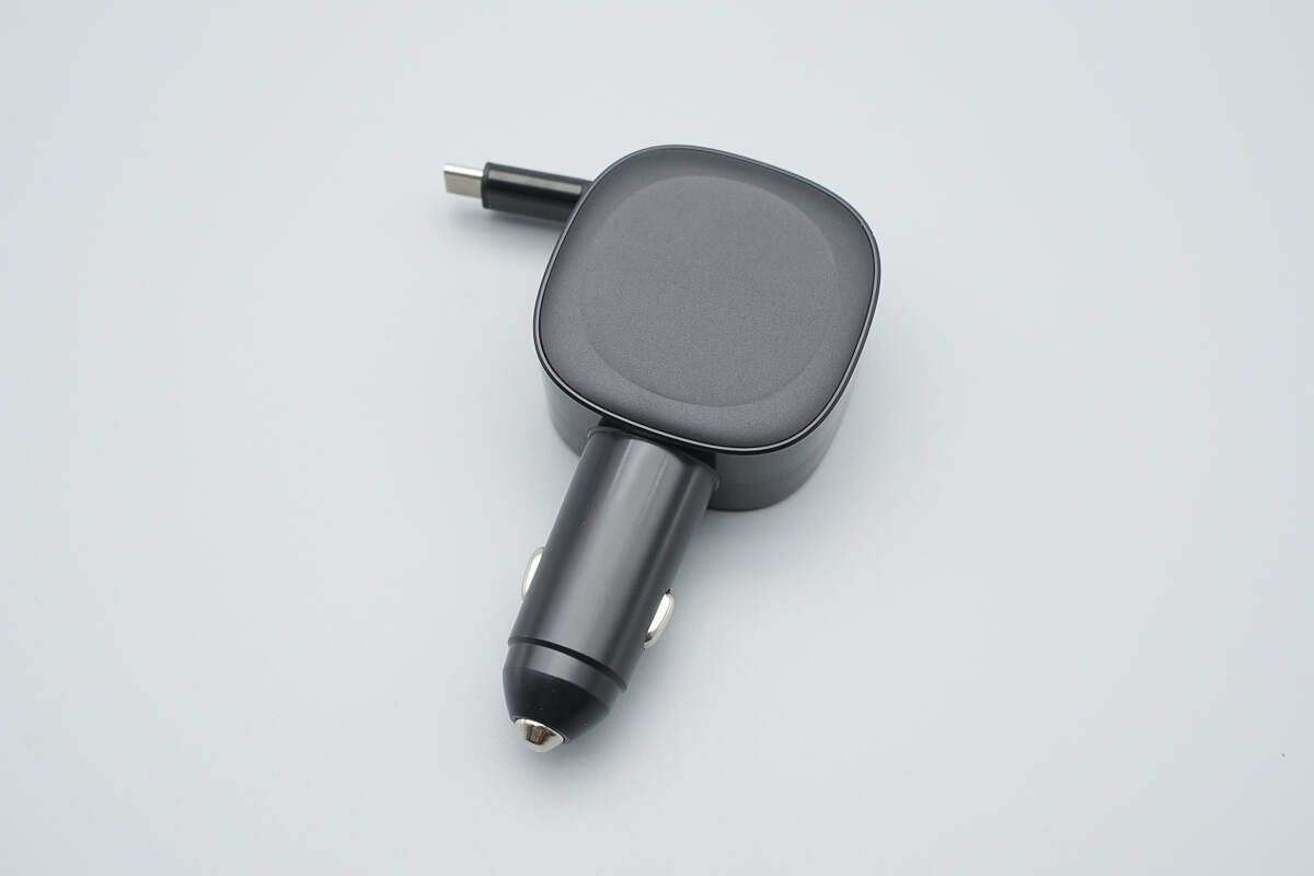 在结构设计方面,D60ACC采用"方中带圆"的一体化造型,机身尺寸为99.64mm×51.3mm×28.95mm,重量仅73.3克。深灰色上盖搭配高光腰线设计,重心向插头端偏移的布局有效防止车辆行驶中的松动。点烟器插头采用金属半球形弹簧顶针结构,配合镀层负极弹片与锥形导角,既保证12/24V车载座中的低接触电阻,又兼顾插拔顺畅性与耐磨性。机身侧面配置的1A1C接口旁设有专用线槽,USB-C端子采用升级TPE高强度线材,72厘米线长配合自动回卷设计,既避免缠绕又保持使用整洁。