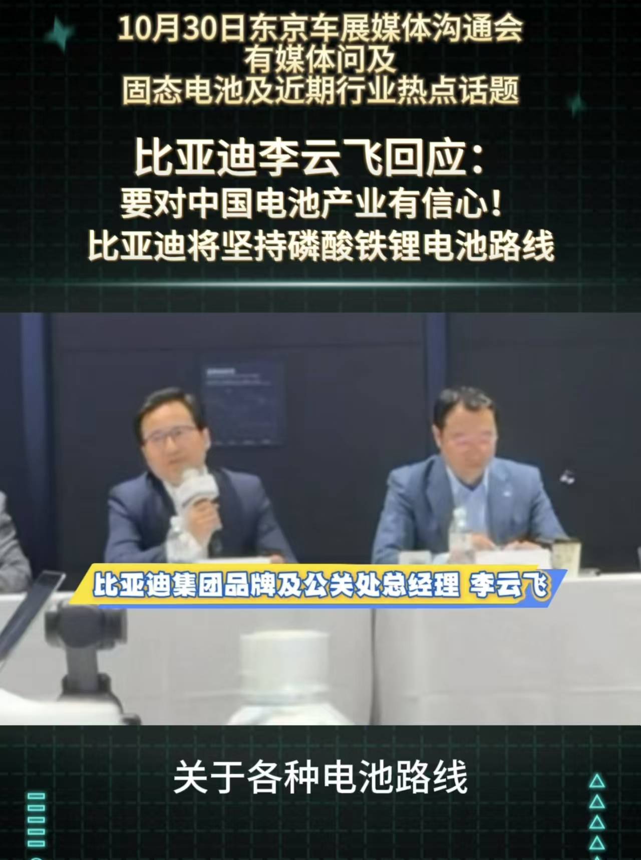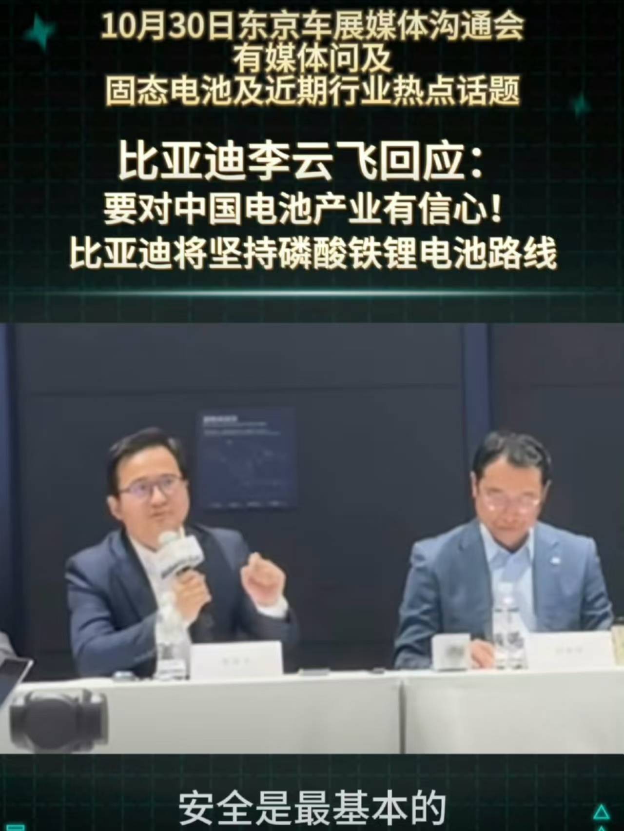 在东京车展的沟通会上,比亚迪高层李云飞公开表态,公司将继续深耕磷酸铁锂技术路线。这一决策背后,是该技术经过多年迭代后展现出的强大生命力,尤其在安全性能方面形成了独特优势。