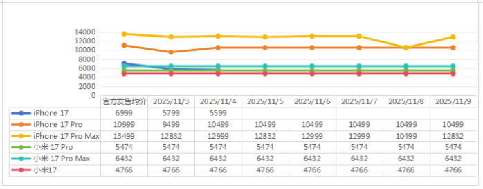 在9月新上市产品中,iPhone 17系列在京东官方旗舰店出现明显价格调整,Pro Max与Pro机型较官方发布价均下降300元,导致整体均价下滑。相比之下,该系列其他机型价格保持稳定,与发售价持平。而在百亿补贴渠道,拼多多平台表现突出,iPhone 17系列不同机型出现200-500元不等的优惠,且上架时间不固定导致均价波动较大。同期监测的小米17系列在百亿补贴活动中价格相对平稳,未出现大幅变动。