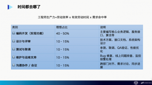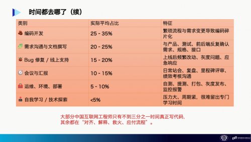 然而,实际情况是:大部分工程师的编码时间只占到1/3,其余都在对齐、解释、救火和应付流程。在像双11大促等不确定性更高的项目中,被更高占比的沟通协作时间所挤压的编码时间甚至降到1/4及以下。对比两张表格,我们可以看到差距之大。