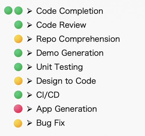 下图是我们对于AI Coding的能力评估,红绿黄代表我们在实践中的评估结果。这个评估会随着使用深入而变化,特别是当企业代码库接入、做了后训练之后,表现会截然不同。
