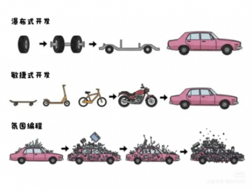 下图是大家比较熟悉的敏捷开发示意图。现在有一种新兴方式叫AI编程、甲板编程。这种编程方式和传统的编程方式对比有一个很大的区别:快。 快到一个人能够成为全栈多面手,涉及前端、客户端、服务端甚至算法。