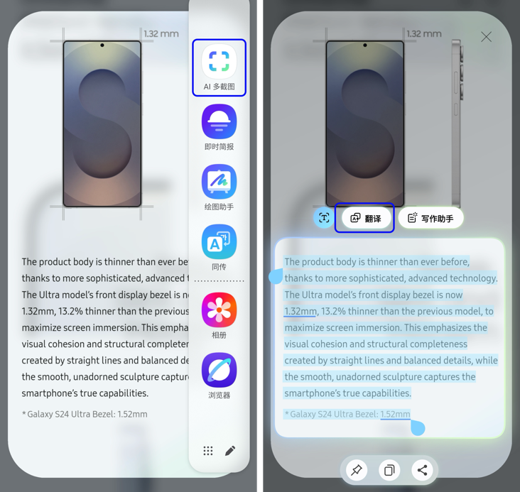 全新的“AI多截图”功能可根据用户行为预判操作意图。比如在浏览外文资料时,用户只需通过AI多截图圈选文字区域,Galaxy AI便可智能识别内容,快速提供翻译、摘要等选项,提升信息处理效率。而在观看短视频时,AI多截图还支持直接圈选视频片段,生成GIF动图,方便用户即时保存或分享到社交平台,让灵感创作更随心所欲。