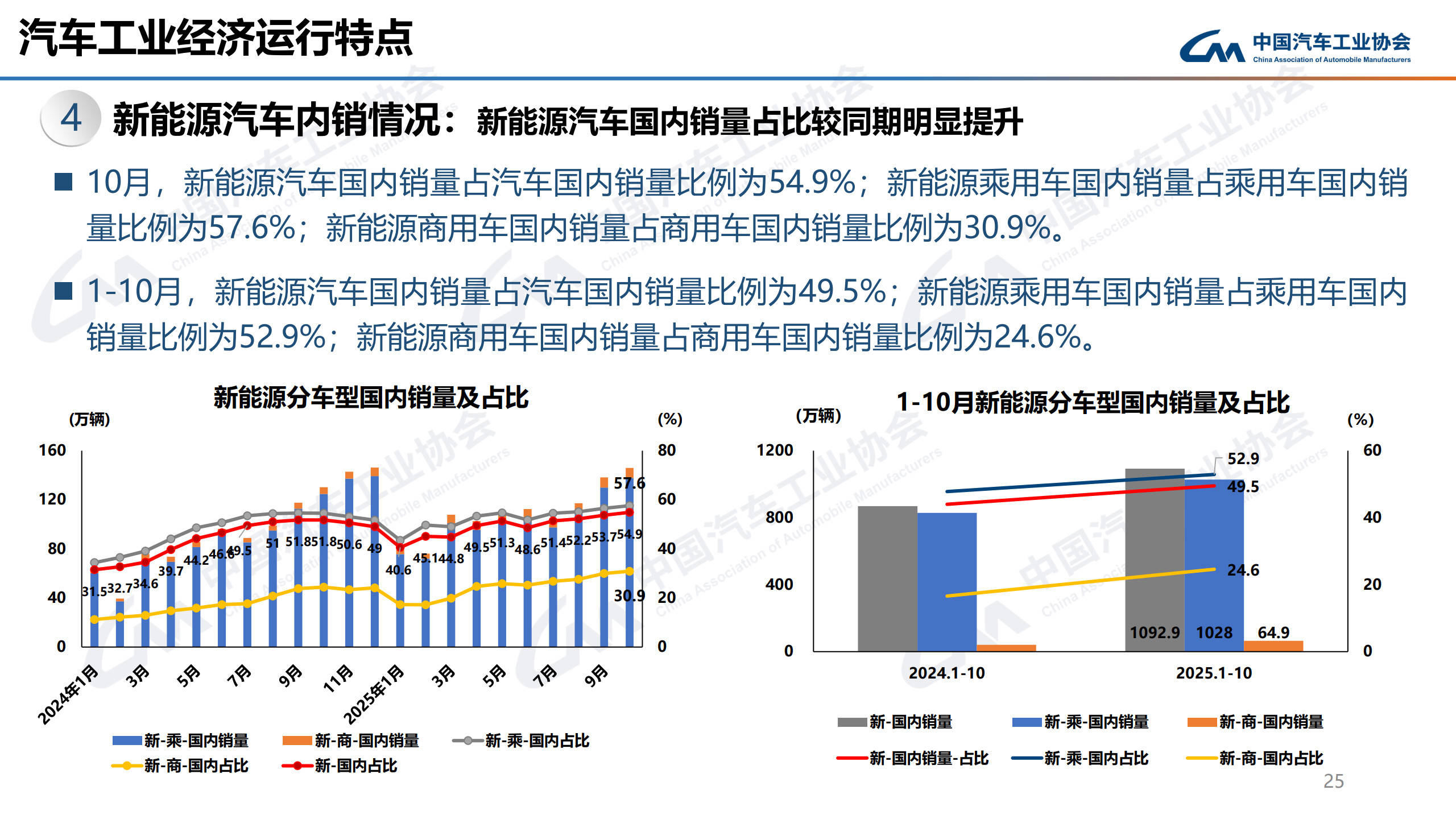 新能源汽车市场保持高速增长,10月产销量分别达177.2万辆和171.5万辆,环比分别增长9.6%和6.9%,同比增幅21.1%和20%。当月新能源新车销量占比达51.6%,首次突破半数。前10个月累计产销量1301.5万辆和1294.3万辆,同比增长33.1%和32.7%,市场渗透率达46.7%。从车型结构看,燃料电池汽车产销出现明显下降,纯电动和插电式混合动力车型保持增长。国内市场方面,10月新能源汽车销量占比达54.9%,其中乘用车占比57.6%,商用车占比30.9%。