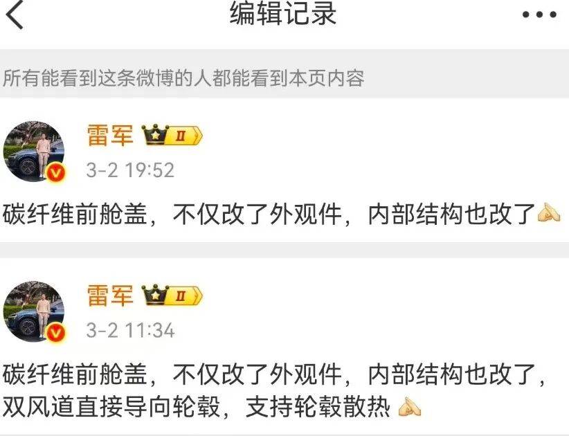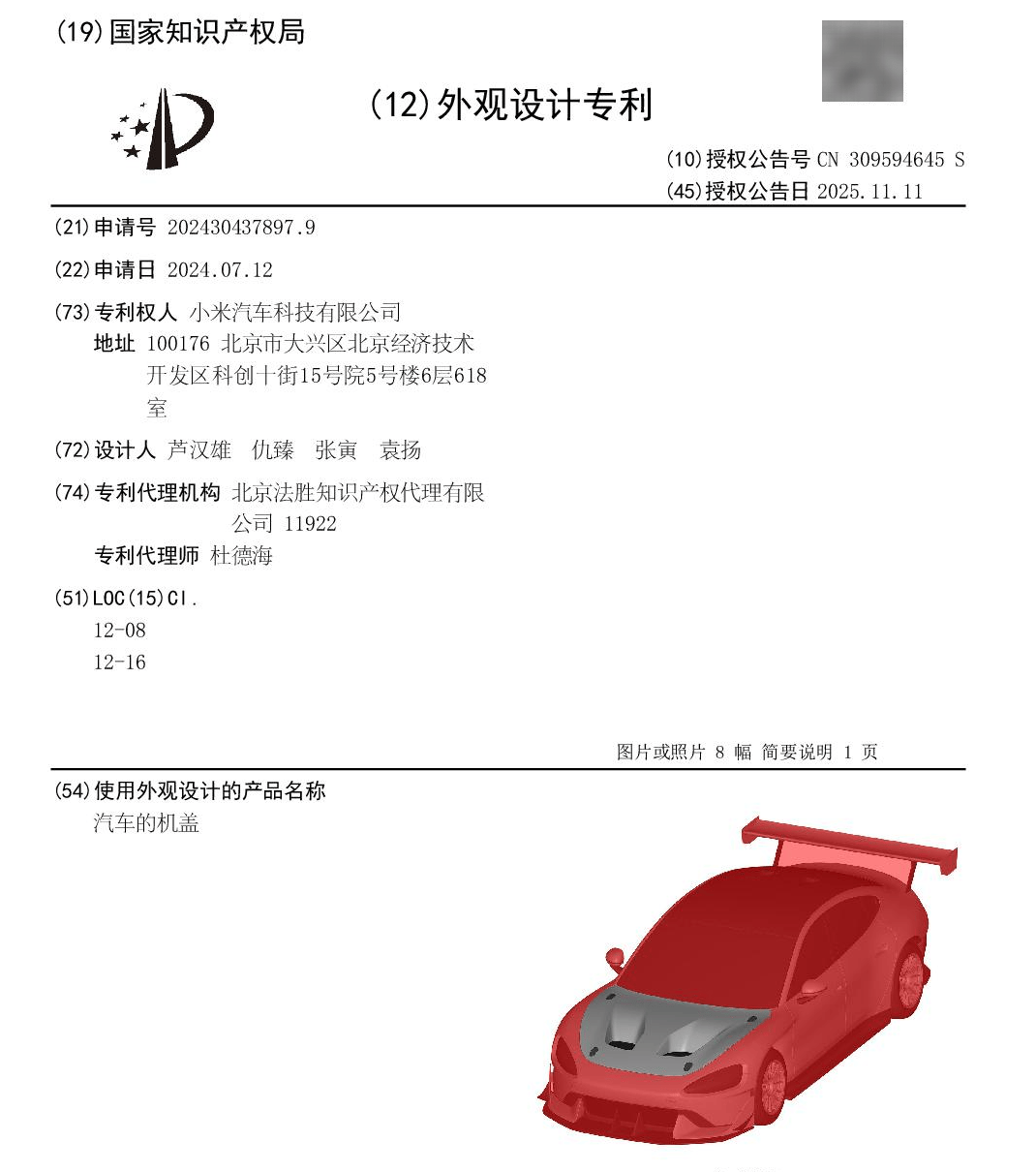 雷军曾在微博中强调,SU7 Ultra的设计不仅注重外观,内部结构也进行了优化。然而,从公告信息来看,该车型的外观专利申请日期为2024年7月,而交付时间早在今年3月,挖孔机盖的集中交付时间为4月至5月。专利简介中明确指出,设计要点仅在于形状,未提及实际功能作用。这一信息表明,小米汽车对挖孔机盖的装饰性属性早有认知。