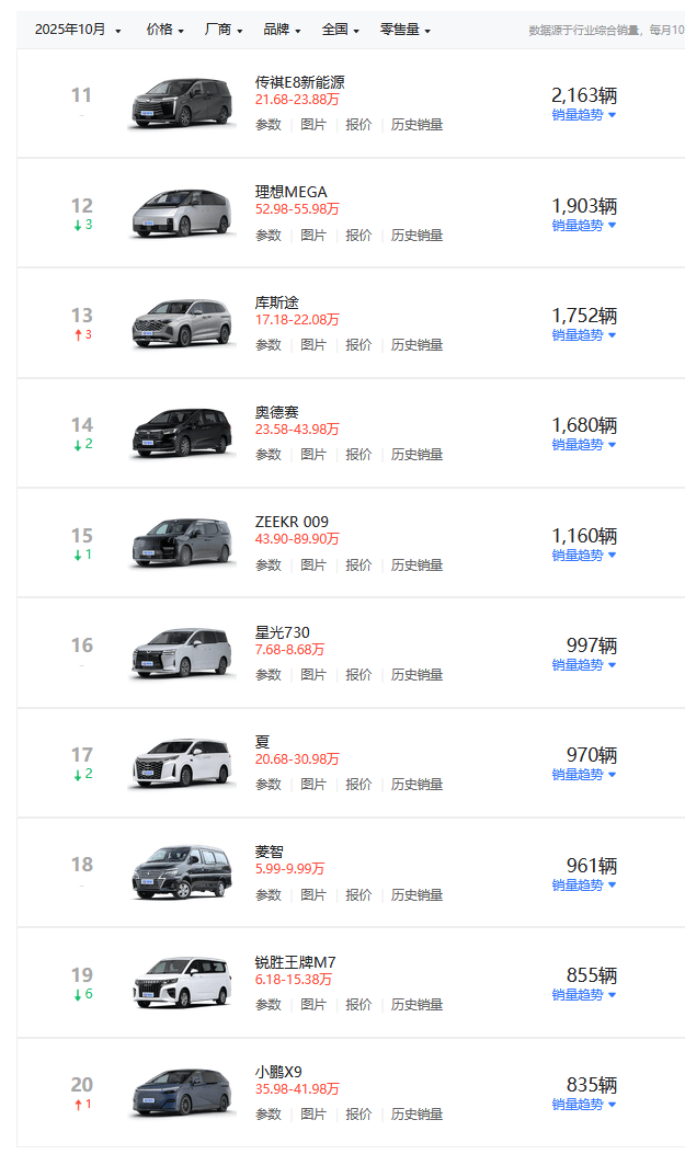 新能源领域竞争愈发激烈。传祺E8新能源10月售出2163台,虽较9月下滑1/3,但考虑到8月促销带来的峰值效应,实际表现仍属稳健。理想MEGA则因电池起火事件影响,销量从9月的3200余台骤降至1903台,不过在50万元以上高端市场仍保持较强竞争力。