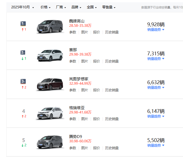 别克GL8家族延续着市场统治力。插混系列(含陆尚、陆尊)10月售出5375台,虽环比下滑23%,但在真龙插混Pro车型的助力下守住了基本盘。燃油版GL8则以3998台的成绩保持稳定,若将插混与燃油版本合并计算,整个GL8家族月销量仍接近万辆规模,继续稳坐MPV市场头把交椅。