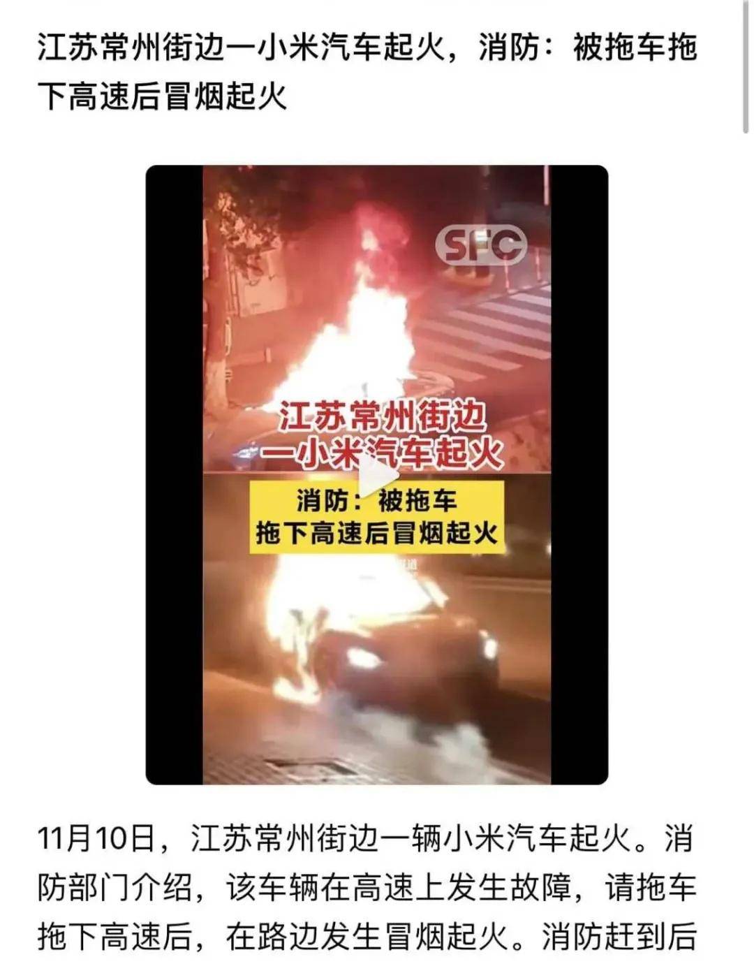江苏常州街头近日发生一起汽车起火事件,一辆小米汽车在路边突发燃烧,所幸未造成人员伤亡。据现场目击者及后续披露的信息,这辆汽车此前因高速故障被拖运至路边,随后出现冒烟并迅速起火。