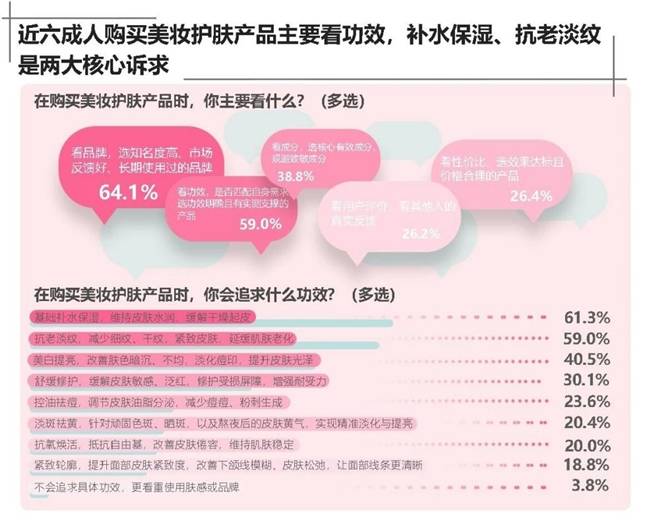 消费者行为调研揭示,美妆产品选购已进入理性与专业并存的新阶段。经济观察报发布的消费调研报告指出,超过九成受访者会主动关注护肤品成分,59%的消费者会根据自身肤质精准选择成分。在经典成分认知度方面,“玻尿酸”以66.8%的知晓率位居榜首,“胶原蛋白”和“烟酰胺”分别以61.9%和57.3%的认知度位列二、三位。