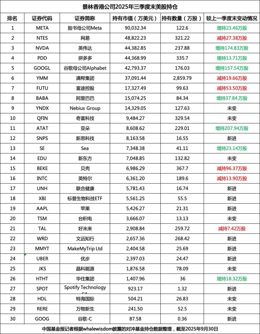 科技领域方面,景林香港延续对头部企业的加仓策略。算力芯片龙头英伟达获大幅增持174.83万股,季末持有市值升至4.44亿美元;脸书母公司meta连续四个季度被加仓,三季度增持23.46万股至122.6万股,稳居第一大重仓股。谷歌母公司Alphabet、网易等科技股仍位列前十大持仓,显示出对全球科技龙头的长期信心。