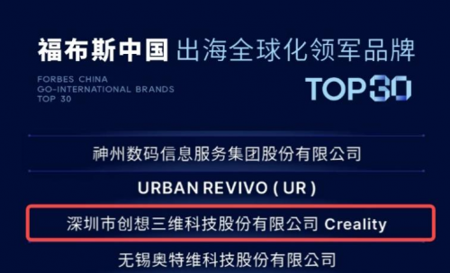 近日,《福布斯中国》正式发布“2025中国出海全球化30&30”榜单。深圳企业创想三维凭借在全球3D打印行业的领先地位与品牌影响力,成功入选“出海全球化领军品牌Top30”,是榜单中唯一聚焦消费级3D打印生态的企业。