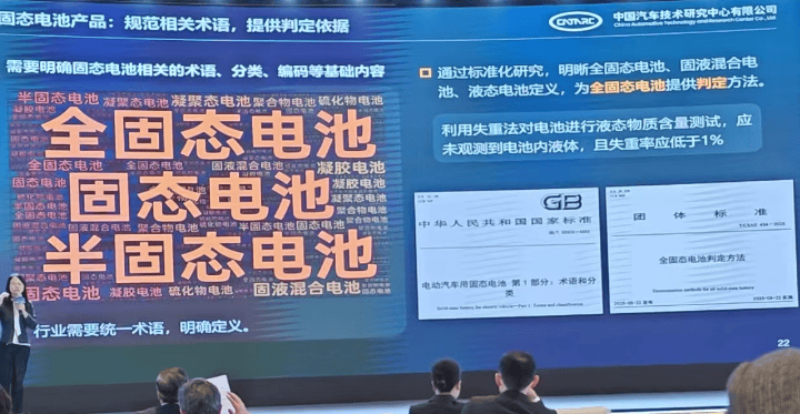 在2025世界动力电池大会上,中国汽车技术研究中心首席科学家王芳透露,我国正加快制定电池术语与分类国家标准,将电池明确划分为液态、固液混合、全固态三大类。这一举措旨在统一行业术语,消除此前因定义模糊引发的争议,例如“半固态电池是否属于固态电池”“液体含量标准如何界定”等问题。