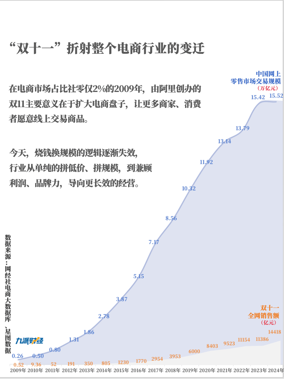 中国电商用17年时间,将双11从一场简单的促销活动,塑造为行业风向标。2009年首届双11仅有27个品牌参与,到2024年全网销售额已占网上零售市场的9%,中国网上零售市场规模也从0.26万亿元飙升至15.52万亿元。然而,当市场增速放缓至0.6%,电商巨头们的竞争愈发激烈——抖音电商每增长一分销售额,半数来自外部平台争夺;拼多多用“百亿补贴”将低价常态化,迫使行业从“大促低价”转向“常年低价”;抖音、快手则通过“货找人”的内容电商模式,重构消费逻辑,在美妆、服装等传统电商领域持续渗透。