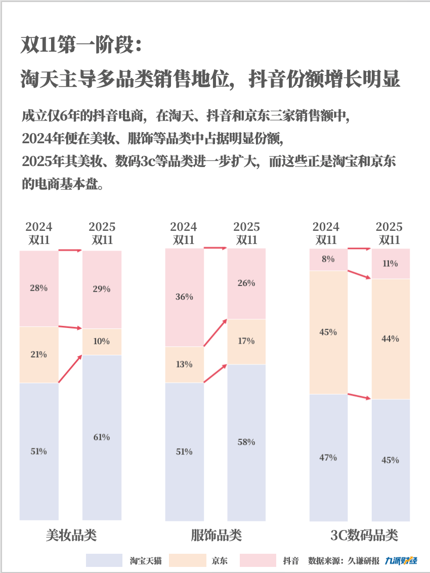 电商行业的内卷,本质是发展阶段演进的必然结果。当市场份额接近天花板,竞争从增量争夺转向存量博弈,平台补贴与品牌利润的边界日益模糊。抖音与淘宝在美妆品类TOP10榜单中重合率达90%,抖音在数码3C、运动户外等品类的份额持续扩大,直接冲击传统电商基本盘。这种零和博弈下,低价吸引的用户极易流失,迫使行业重新思考双11的价值——它不再是一场GMV的数字游戏,而是修炼内功、提升效率的演练场。AI技术的应用,或将成为未来竞争的关键战场。
