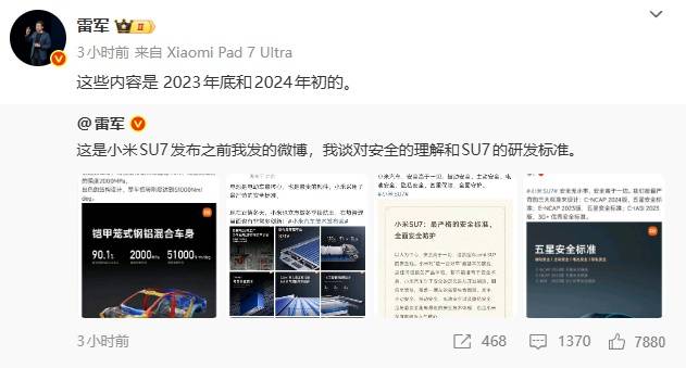 面对网络流传的"外观优于安全"等断章取义的言论,雷军通过多条动态进行澄清。他引用去年4月的采访内容解释称:"当时强调产品需要具备视觉吸引力,这与安全设计并不冲突。正如轮毂设计需要兼顾美学与结构强度,智能汽车必须实现多重价值的平衡。"数据显示,小米SU7在研发过程中同步推进了被动安全、主动安全、电池防护及数据隐私四大安全体系的建设。