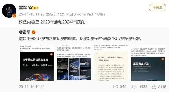 在近期与网友的互动中,雷军针对网络上的争议言论作出明确回应。他指出,部分网民存在断章取义、刻意对立的现象,将汽车产品的“外观设计与安全性能”这两个本应相辅相成的要素人为割裂。这一表态引发了公众对新能源汽车安全标准的广泛讨论。