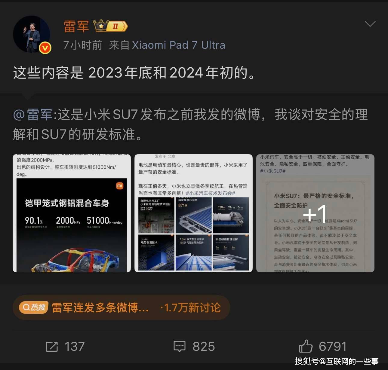 去年,雷军曾提到“一辆车,好看是第一位的”,这句话被部分网友解读为小米造车过度注重外观而忽视安全性能。面对这一误解,雷军在11月16日连发多条微博,直接回应质疑。他明确表示,安全始终是小米汽车研发的核心原则,“安全是基础,是前提,是高于一切的”。他进一步解释,小米SU7的研发标准完全围绕安全展开,从设计到生产,每个环节都严格遵循安全规范。
