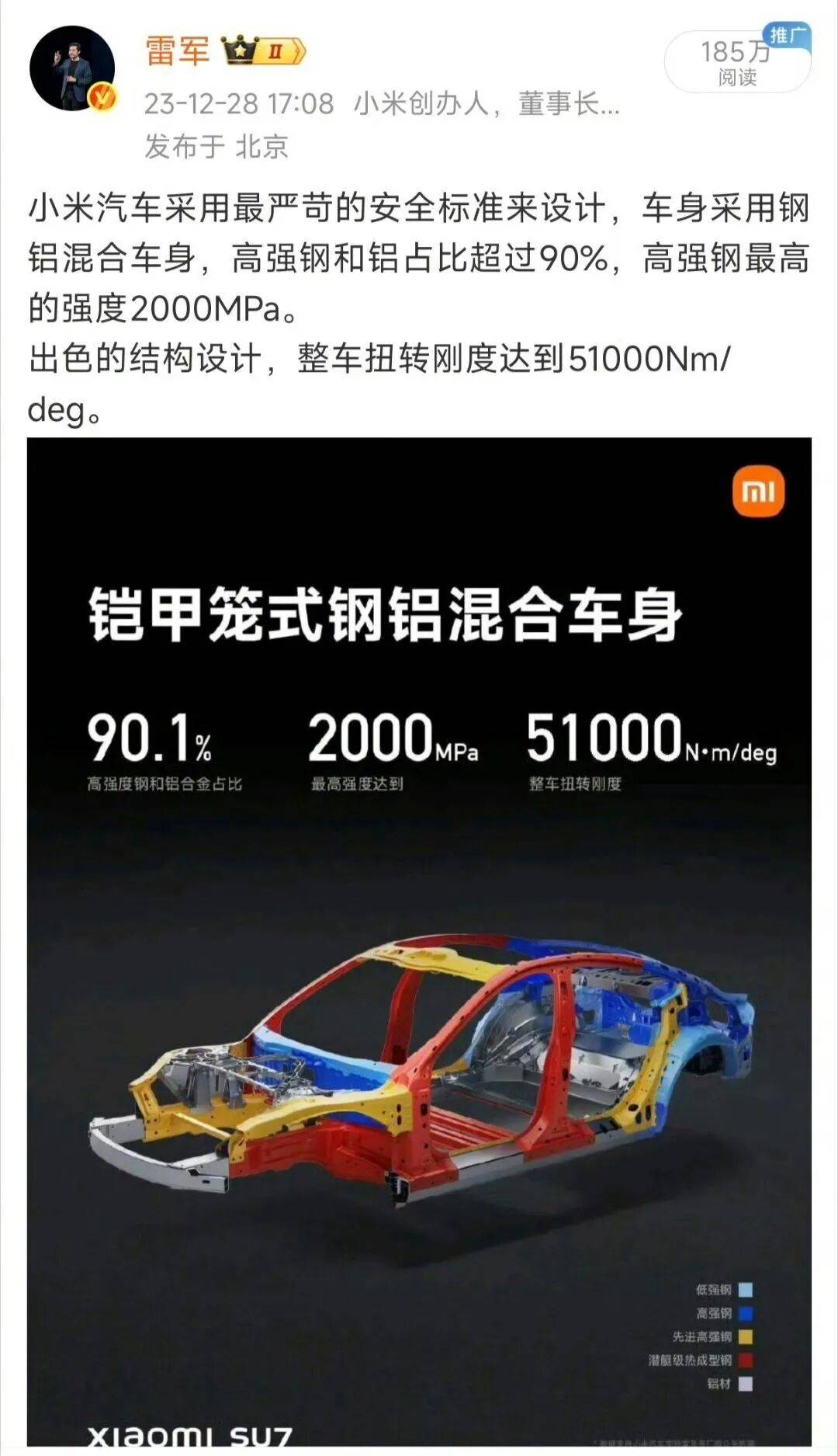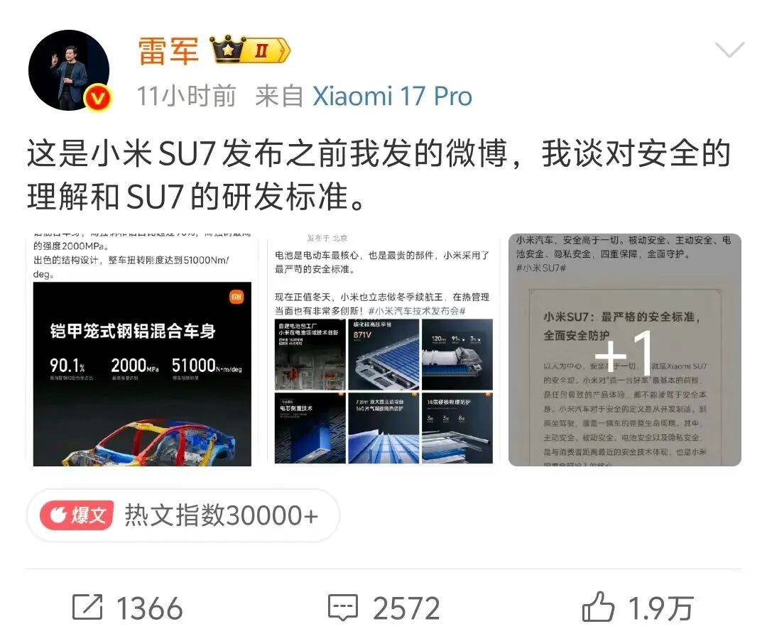 近日,小米汽车创始人雷军在社交平台连续发布动态,针对外界关于小米SU7“重颜值轻安全”的争议作出正面回应,相关话题迅速登上微博热搜榜。