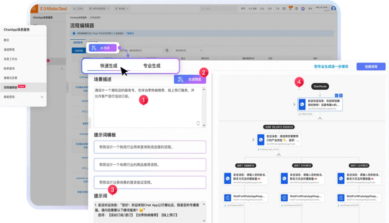 3、消息自动化:内置可视化流程编辑器,支持 0 代码配置复杂业务逻辑,结合不同流程组件实现多轮交互和消息的自动化触达;支持接入海内外主流大语言模型或智能体应用。实现智能客服、智能导购、意向客户挖掘等场景快速落地;支持通过自然语言描述即可创建 Chat Flow(对话流程画布),实现消息流程的设计与文案编写、多语言翻译等内容生产,将消息交互设计能力赋予业务人员。