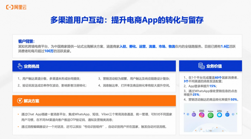 某知名跨境电商品平台,通过使用 Chat App,完成覆盖 60 个国家消费者,3 个不同渠道的消息发送配置,App 登录率提升 15%,通过 WhatsApp 接收营销信息的点击率提升 25%。