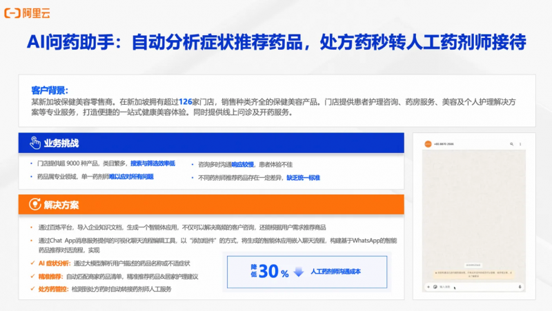 某新加坡保健媒融零售商,通过 Chat App 搭建了 WhatsApp 上的智能对话机器人,成功将人工药剂师的沟通成本降低了 30%。