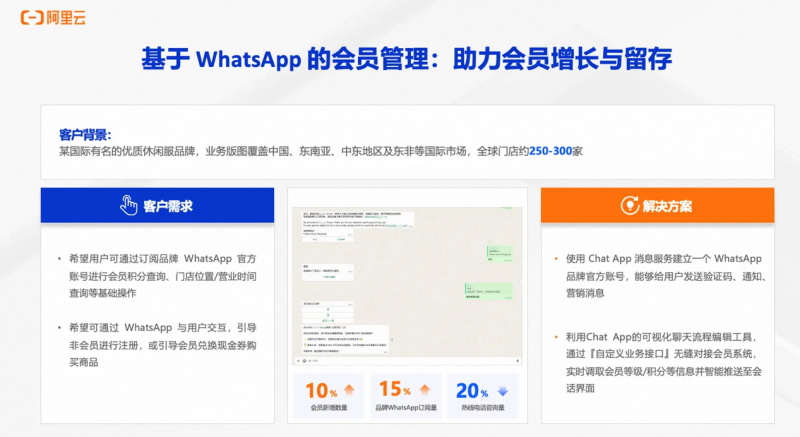 某国际知名休闲服装品牌,使用 Chat App 消息服务建立了一个 WhatsApp 品牌官方账号,向用户发送验证码、通知、营销消息,同时无缝对接了其会员系统,实时调取会员等级/积分信息并推送至会话界面,实现品牌 WhatsApp 订阅量提升 15%,会员新增数量提升 10%。