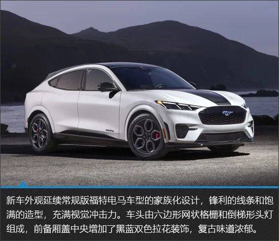 外观是这款特别版车型最直观的亮点。车身以纯净白色为基底,搭配黑蓝双色拉花与专属铭牌,既保留了福特电马标志性的动感轮廓,又通过细节处理展现出独特的自由气质。设计师巧妙地将按键式车门融入整体造型,这种充满未来感的开启方式不仅提升了科技氛围,更优化了车身的空气动力学表现,与低风阻线条形成完美呼应。整车设计语言在运动与优雅之间找到了平衡点,既适合城市穿梭,也能在郊外道路吸引目光。
