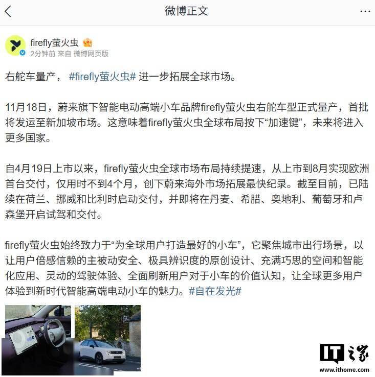 蔚来旗下智能电动小车品牌firefly萤火虫迎来重要里程碑——右舵车型正式开启量产,首批车辆即将发往新加坡市场。这一动作标志着该品牌全球化战略进入加速阶段,未来计划拓展至更多国际市场。