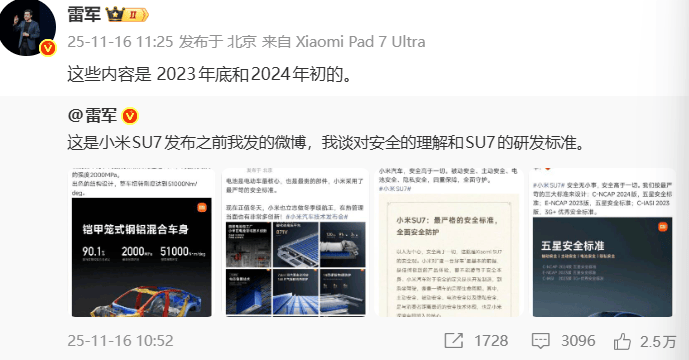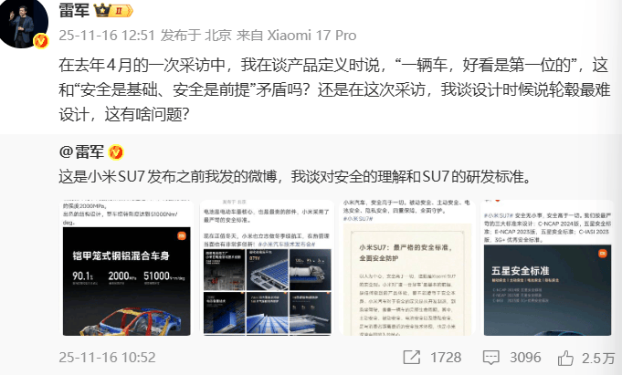 争议焦点源于雷军此前关于产品设计的公开表述。他解释称,去年4月采访中提及“车辆外观重要性”的言论,与“安全是基础”的原则并不冲突。针对轮毂设计难度的讨论,他也强调这是技术层面的专业观点,却被部分网友刻意曲解。为驳斥不实信息,雷军特意晒出四则历史微博截图,其中2023年12月28日的发文明确指出:“电池作为电动车最核心部件,小米采用了行业最严苛的安全标准。”