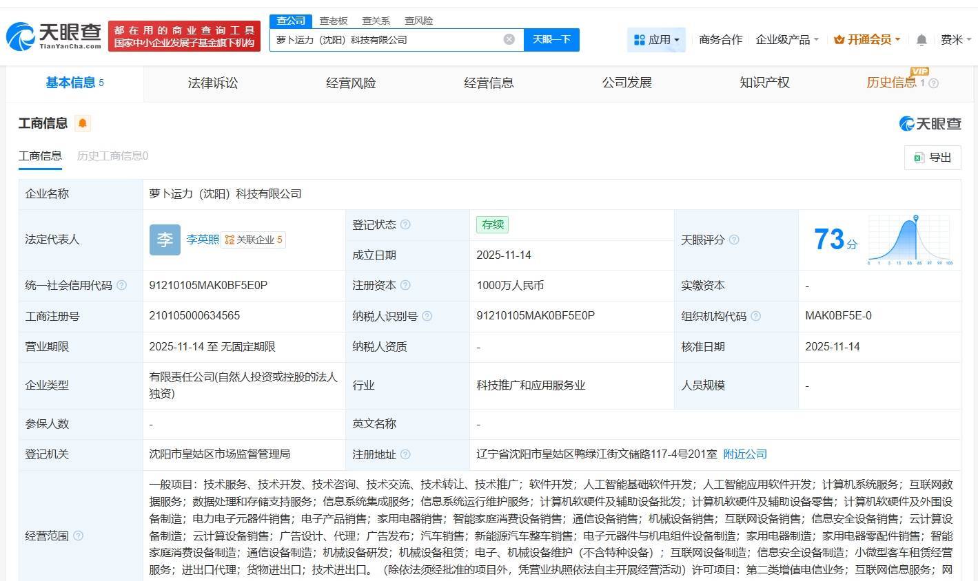 据工商信息平台天眼查最新披露,一家名为萝卜运力(沈阳)科技有限公司的新企业已完成注册登记。该公司法定代表人为李英照,注册资本达1000万元人民币,业务范围覆盖人工智能基础与应用软件开发、计算机系统服务等多个科技领域。