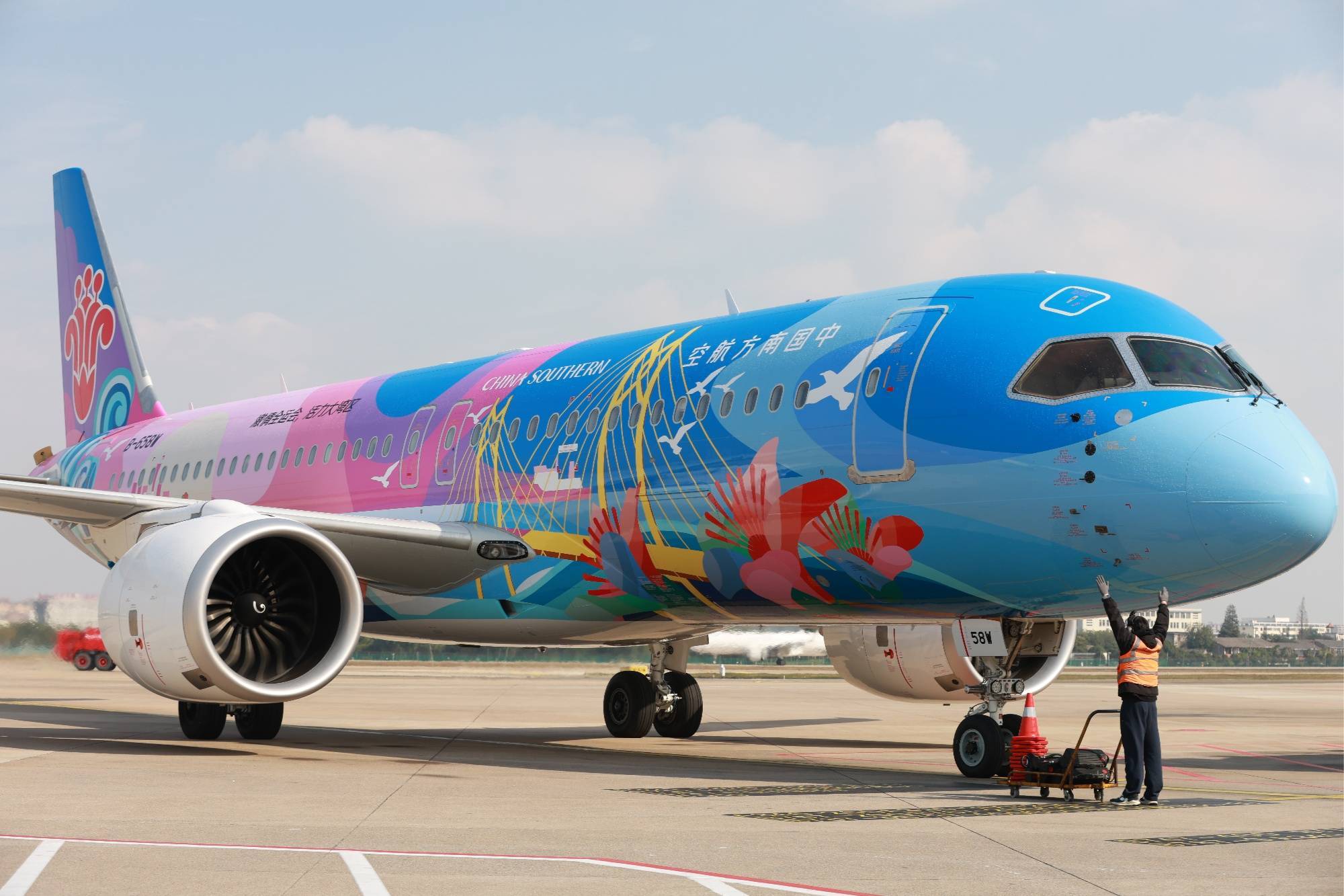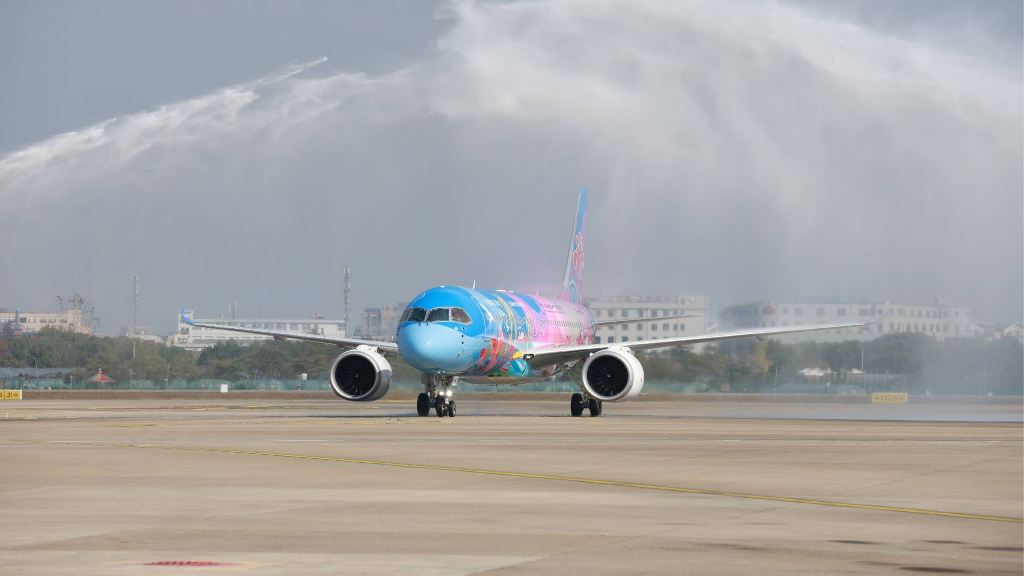 央广网宁波11月19日消息(记者刘欣莹)11月18日10时24分,搭载着162名旅客的CZ3777航班平稳降落宁波栎社国际机场。这架身有十五运会彩绘飞机“大美湾区”号,注册号为B-658W的C919国产大飞机,缓缓滑行通过象征民航界最高礼遇的“水门”,今后宁波人在“家门口”就能亲身感受我国航空工业的最新成果。