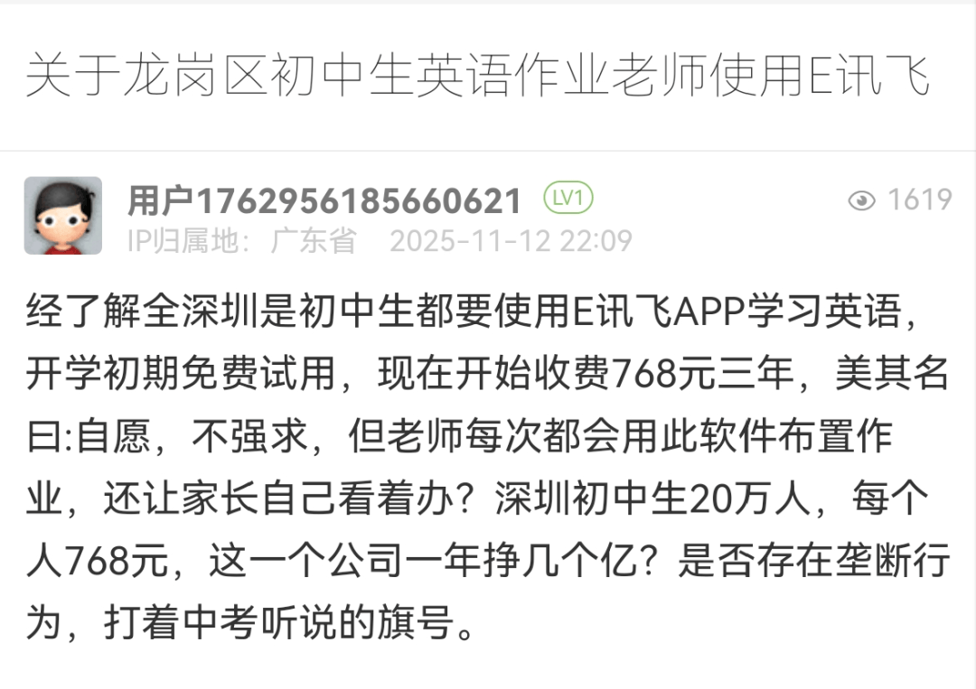 近日,有市民通过《问政深圳》平台反映,龙岗区某初中要求学生使用一款收费APP完成英语作业,引发家长对收费合理性的质疑。尽管校方称使用该软件为自愿原则,但家长指出教师频繁通过该平台布置任务,且768元的年费对于深圳庞大的初中生群体而言负担较重,同时怀疑相关企业存在市场垄断行为。