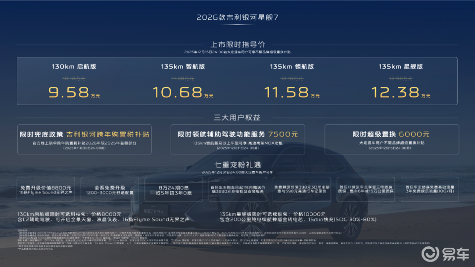 吉利银河品牌迎来重磅力作——2026款银河星舰7 EM-i正式登陆市场。这款基于GEA新能源专属架构打造的首款电混SUV,以"五新标杆"产品力重新定义主流电混SUV市场标准。新车推出四个版本配置,限时指导价区间为9.58万元至12.38万元,通过电池、续航、智能、安全、舒适五大维度的全面升级,展现出吉利在新能源领域的技术积淀与用户洞察力。