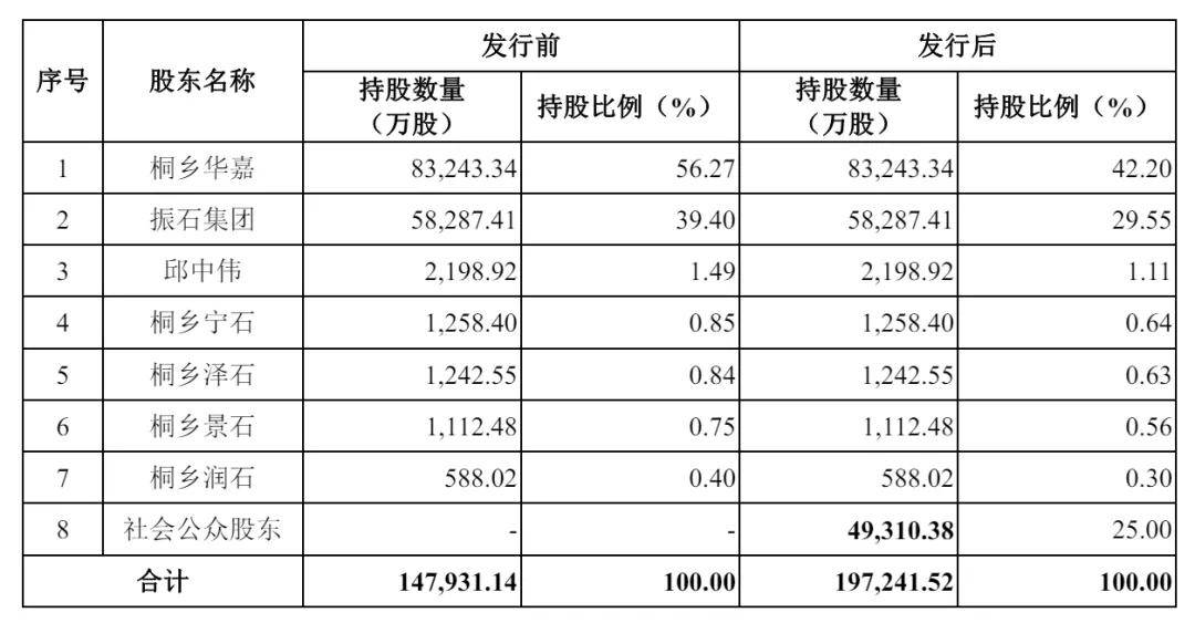 在股权结构方面,公司呈现高度集中特征。发行前,实际控制人张毓强及其子张健侃通过桐乡华嘉、振石集团等主体合计控制96.51%股份。其他股东包括持股1.49%的邱中伟,以及桐乡宁石、桐乡泽石等员工持股平台。IPO完成后,桐乡华嘉与振石集团仍将保持控股地位,持股比例分别为42.2%和29.55%,公众股东持股比例将显著提升。