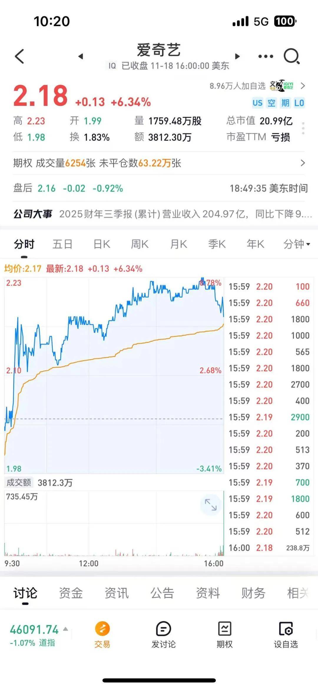 成本方面,爱奇艺第三季度总成本为54.7亿元,同比下降3%,其中内容成本为40.4亿元。销售及管理费用为9.3亿元,研发费用为4.1亿元。在Non-GAAP标准下,公司运营亏损为2190万元,归属于爱奇艺的净亏损为1.5亿元。截至2025年9月30日,公司现金余额(包括现金、现金等价物、短期受限资金、短期投资及预付及其他资产中的长期受限资金)总计48.8亿元。当日收盘时,爱奇艺股价上涨超过6%,报收2.18美元,市值达21亿美元。