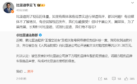 比亚迪集团品牌及公关处总经理李云飞近日通过社交媒体发声,强调企业对于媒体监督的开放态度与对恶意抹黑行为的零容忍立场。他表示,作为行业头部企业,比亚迪欢迎基于事实的理性批评与建设性意见,对于因信息偏差导致的误解性报道也能保持包容,但针对长期蓄意诋毁、传播不实信息的黑公关行为,将坚决采取法律手段维护权益。