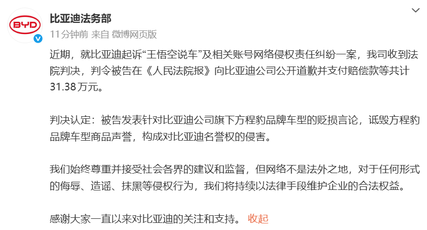 比亚迪法务部近日对外发布消息称,公司在一场网络侵权责任纠纷案件中赢得胜诉。此次案件的被告为“王悟空说车”及其相关账号,法院已作出明确判决。