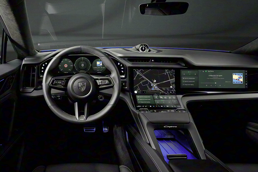 内饰布局围绕驾驶者展开,14.25英寸OLED全数字仪表盘与三辐式运动方向盘构成核心操控区,驾驶模式选择按键直接集成于方向盘之上。12.25英寸“Flow Display”流动显示屏以微曲面设计贴合中控台,可选装的87英寸AR抬头显示系统则将虚拟信息投射至驾驶视野。副驾娱乐屏提供14.9英寸超大选项,与中控屏形成双屏联动。这套被命名为“Porsche Driver Experience”的驾驶体验系统,通过软硬件深度整合,实现了从信息交互到娱乐功能的全面升级。